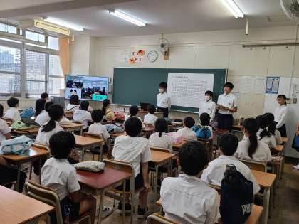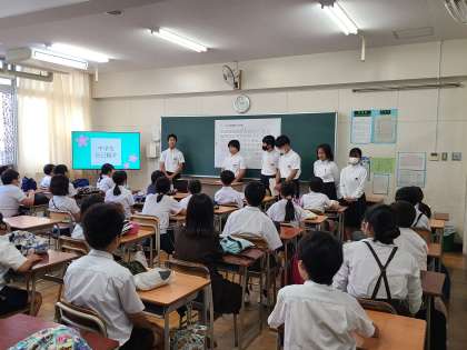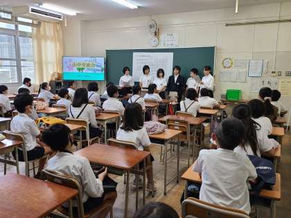 本日の小中交流会の様子です。小学生を7つのグループに分け、中学生から学校説明を行っています。