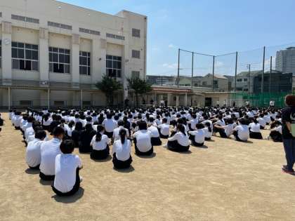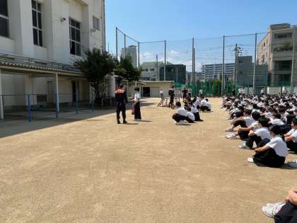 本日5限に火災を想定した避難訓練を行いました。消防署の方から消火器の使い方を学び、各クラスの代表生徒が水消火器で練習をさせていただきました。