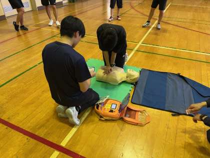 また、放課後には教職員対象の救急救命講習会を実施しました。胸骨圧迫の方法やAEDの使い方などを教えていただきました。