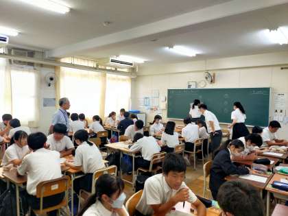 効率と公正の共存を考えさせるため、テニスの試合を題材に、グループで話し合い、発表していました。