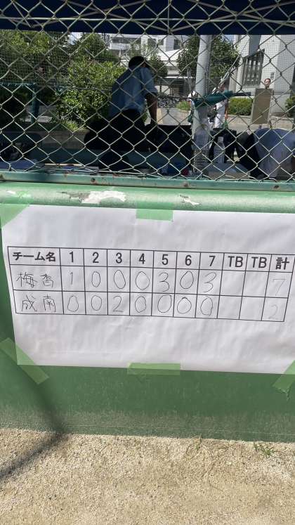 梅香は初回相手のエラーでチャンスを作り、長打で先制します。また梅香は3回にもチャンスを作りますが、見逃し三振でチャンスをつぶします。その裏梅香の1つの四球から、成南1年生捕手に逆転2ラン本塁打を打たれます。焦る梅香は、エラーも出ますが、なんとか0で凌ぎます。5回梅香は1つの四球から、2連続長打で逆転に成功。今日チャンスで2連続見逃し三振をして、責任を感じていた主将の見事なライトオーバーでした。その後の7回も3点のダメ押し追加点。梅香は1回戦を突破することができました。成南投手が良く、中盤まで焦る展開になりましたが、やっぱり四球がお互いのキーポイントとなりました。来週の2回戦に向けて、また明日から今日できなかったポイントの修正を頑張っていきたいです。本日は、あの暑い中保護者のみなさまが、たくさんお越しくださいました。応援ありがとうございました。