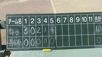 梅香は初回いきなり連打で3点先制します。2回以降もチャンスをつくり、積極的に攻撃をしかけます。スコアリングポジションにランナーを進め、どんどんタイムリーが出る展開になり、梅香優位に試合が進みます。一方喜連中は、なかなか梅香守備の好プレーに阻まれ、ランナーを出すことすらできません。4回に初めてランナーを出しますが、0で抑えます。梅香は5回には、ダメ押しとなる3打点タイムリー長打で試合を決定づけます。最終回に梅香守備が乱れますが、梅香投手が5回をしっかり投げきり、勝利することができました。