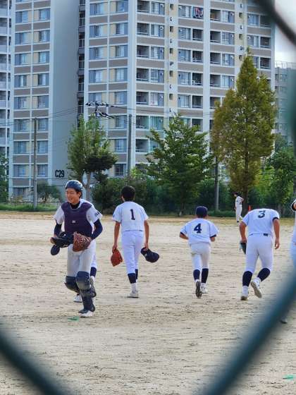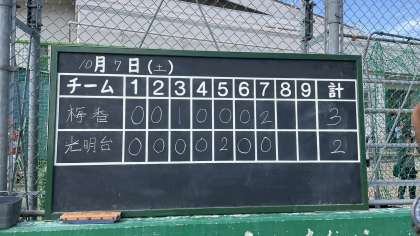 今日の試合はお互いに投手戦になります。梅香は初回ランナーを出しますが無得点。光明台も三者凡退で終わります。試合が動いたのは3回、四球でもらったランナーをおいて、梅香打者がライト前にヒットを打ちます。ライトの次のプレイが悪送球になり、ランナーが進みます。そして間髪いれずに1.3塁の挟殺プレーが悪送球につながり、梅香は先制します。そこから試合が落ち着きますが、5回にピンチになります…。ヒットで出たランナーをバントで進められ、光明台強打者のボテボテの打ち損じを梅香内野手がまさかのお手玉…ピンチが広がります。その後、ショートに叩きつけられた打球処理と送球間に光明台ランナーの好走塁で2人生還し、逆転されてしまいます。しかし今日の梅香は最終回、劇的な展開になります。先頭の死球をもらい、しっかり送って梅香1番打者が右中間に同点二塁打。そして3番打者の3塁ゴロがイレギュラーし、レフト線に抜けていくラッキーも重なり逆転に成功します。その裏、ヒットを打たれ一打同点のピンチを迎えますが、投ゴロてに抑えゲームセット。梅香中は接戦を制して、勝利することができました。今日は舞洲(市の大会準決勝、決勝)で学んだ内外野の間のフライをことごとくアウトにしたセカンド、勝負どころのライナーをアウトにしたライトの好守備が光るナイスゲームでした。ただバントや走塁精度があまりにも低い…これからの梅香の課題もたくさん見つかった試合になりました。今日も朝早くから、たくさんの保護者や同級生の友人が遠方まで応援にきてくださいました。本当にありがとうございました。