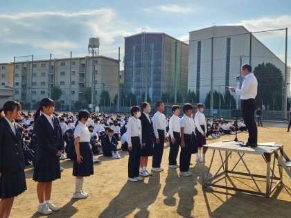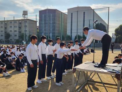 今日は、軟式野球部とソフトテニス部の表彰からはじまりました。テスト期間にもかかわらず、本当によく頑張りました。おめでとうございます。