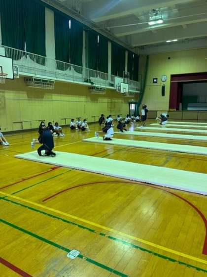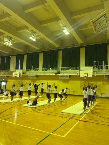 種目はマット運動です。6つの班に分かれて、自分の苦手な技を繰り返し練習したり、得意な技に磨きをかけたり、時には班員を補助したりと、全員で協力して取り組んでいました。