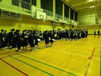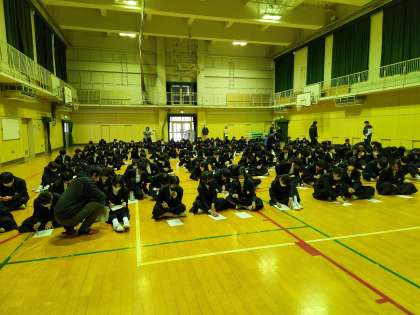 来年度の修学旅行に向けて、平和学習を実施しています。今日は体育館にて、戦時中の沖縄擬似体験学習をしました。戦時中の沖縄の住民になったつもりでシミュレーションすることで、ガマで起こったシミュレーションすることで当時の人々の思いを考えるいい機会となりました。
