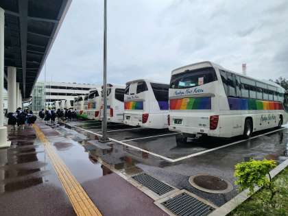 現在小雨がぱらついていますが各クラス、平和学習のためガマ(自然洞窟)に向かっています。ここから、クラスごとの行動になります。