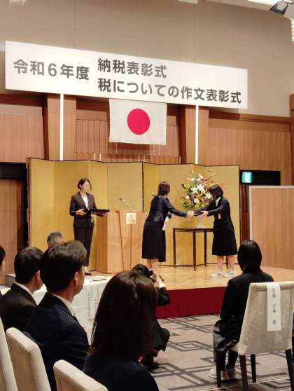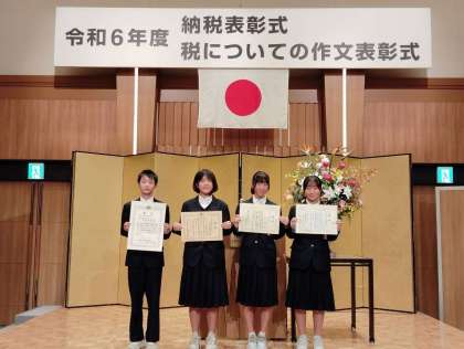 本日、ホテル阪神にて税の作文の表彰式が実施されました。これは社会科の夏休みの宿題の優秀作品が選ばれ、本校3年生から4名選出されました。緊張した様子が見られましたが、堂々と表彰状を受け取っていました。4名のみなさん、おめでとうございます。