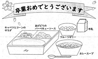給食関係者にも謝罪。今日はズームではなく広角で撮るべきでした。どれだけおかずがあるんだ! と叫びたくなるほど、おかずが多い!(チラシで確認ください) さすが、卒業お祝い献立。卒業したら食べれないのが残念ですが、最後まで味わって食べましょう。