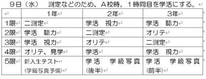4月9日は特別時間割で視力・聴力・二測定が行われています。