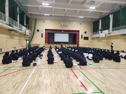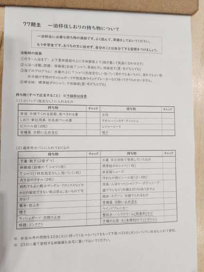 委員長からの目標、施設などの説明、カッター体験の順番確認などを行いました。本日一泊移住に必要な持ち物(入学式に配布したものを加工)に関するプリントを配布いたします。この土日でしっかり確認しましょう。名前の書き忘れないようにしてください!
