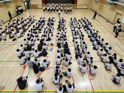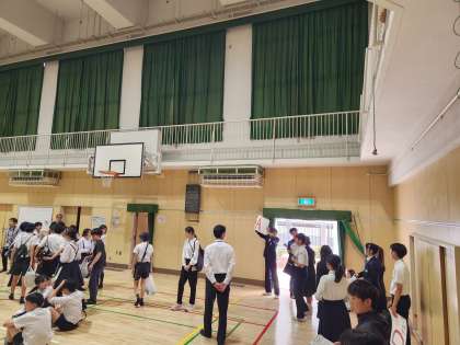 本日、13時40分より校区3小学校6年生をお招きして、小中交流会実施しています。体育館での吹奏楽部によるオープニングセレモニーのあと、グループに分かれて教室での学校紹介です。