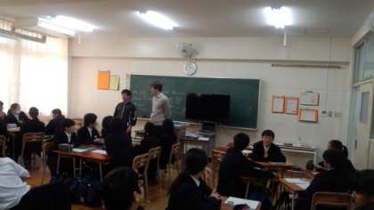 4月12日(火)、5時限目、1年生のクラスで、英語の授業が教科担任の先生とC−NETの先生の二人で行われていました。教科担任の先生の指示で6つの班に分かれ、班長と記録係を決めて、C−NETの先生に対する質問を一生懸命考えていました。学び合い学習の成果でると良いですね。