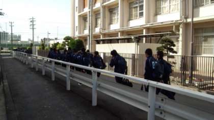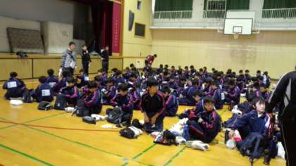 4月26日(火)、朝8時10分、出発式を体育館で行い、バスに移動です。今日から一泊二日で一年生は、兵庫県立南但馬自然学校に行ってきます。