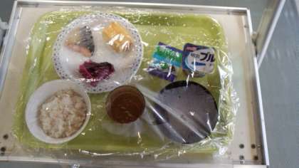 今日の朝食のメニューは、ます焼き、玉子焼き、ふりかけ、漬物、ヨーグルト、ご飯、味噌汁です。いただきます。