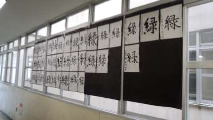 今日の紹介は、習字の作品です。2年生が使用している3階廊下の教室前に先月から生徒の作品が貼り出されています。「緑」という一字の作品です。新緑の5月からあっという間に2か月が過ぎ去り、今は盛夏の7月、暑い日が毎日続いていますが、字を見ていると何となく穏やかな気持ちにもなれます。中にはとても上手にかけている作品もたくさんあります。ぜひ機会を見つけて、ご覧いただければ幸いです。