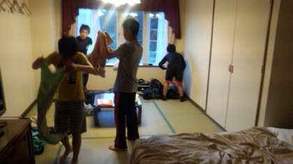 各自お部屋で、テレビを見たり寛いでいます。大浴場へは7時半まで、売店ではお土産を買ってもOKです。夕飯は、7時半から8時半までグループで戴きましょう。