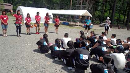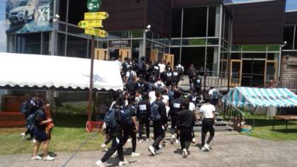 今からは、選択アウトドア体験に分かれてバスごとに出発です。ウェイクボート、クライミング、シャワーウォーキング、渓流釣り、そしてEXアドベンチャーです。