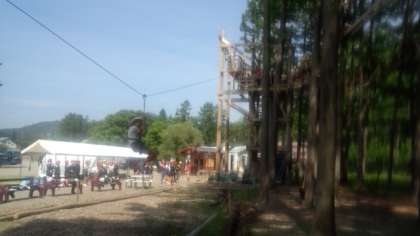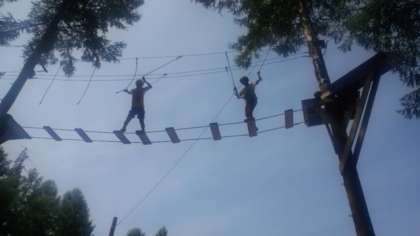 木の上の高い所にのぼって、次から次とアスレチックを楽しんでいます。ジップラインも人気の高いアトラクションです。