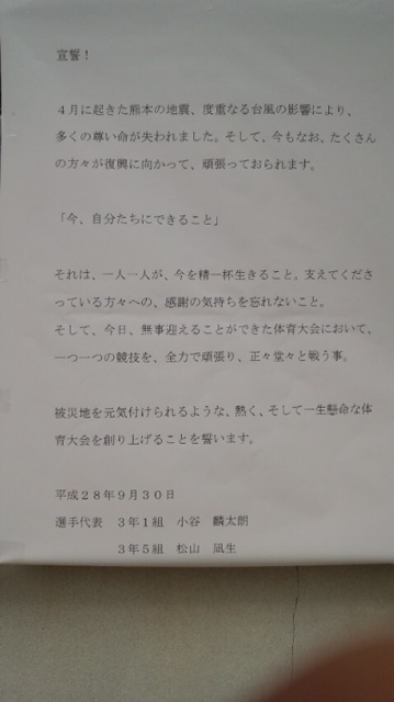 宣誓 4月に起きた熊本の地震、度重なる台風の影響により、多くの尊い命が失われました。そして、今もなお、たくさんの方々が復興に向かって頑張っておられます。「今、自分たちにできること」それは一人ひとりが今を精一杯生きること、支えてくださっている、方々への感謝の気持ちを忘れないこと。そして、今日、無事に迎えることができた体育大会にといて、一つ一つの競技を、全力で頑張り、正々堂々と戦うこと。被災地を元気づけられるような、熱く、そして、一生懸命な体育大会を創りあげることを誓います。