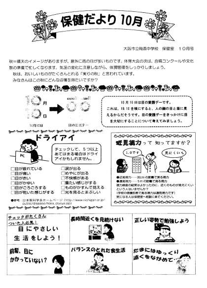 先日発行され配布した保健だよりを今日は紹介します。10月号は目についての特集記事が掲載されていました。10月10日は、目の愛護デーでした。このことにちなんでのことでしょう。