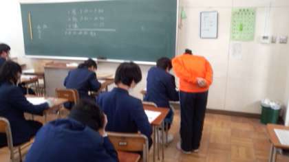 1月26日(木)、インフルエンザ等による2年生の学級休業措置を終えて、全学年が今日から平常授業となりました。ただし、3年生は学年末テストの最終日で、1限目は理科・2時限目は社会・3時限目は保健体育のテストを受けていました。中学生として受ける最後の大きなテストでした。自分が思うような答案に仕上げられなかった生徒も多くいたようですが、みんなよく頑張っていたと思います。テスト後は、家から持ってきたお弁当を食べて、中には、緊張して食べ物が喉を通りにくそうにしている子もいたようですが、それぞれ私立高校への出願に向かいました。