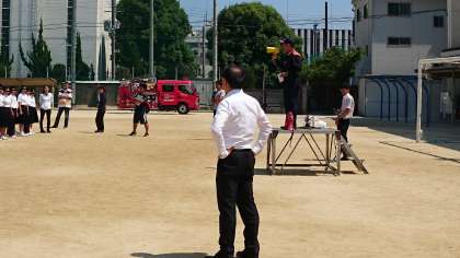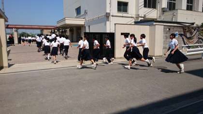 調理室(4階)より火災が発生した想定での訓練で、生徒たちは速やかに担任の先生の指示により避難しました。