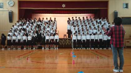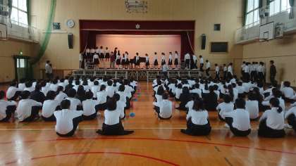 全体練習(体育館)を行いました。そこで、舞台への入退場の流れなどを全体で確認しました。