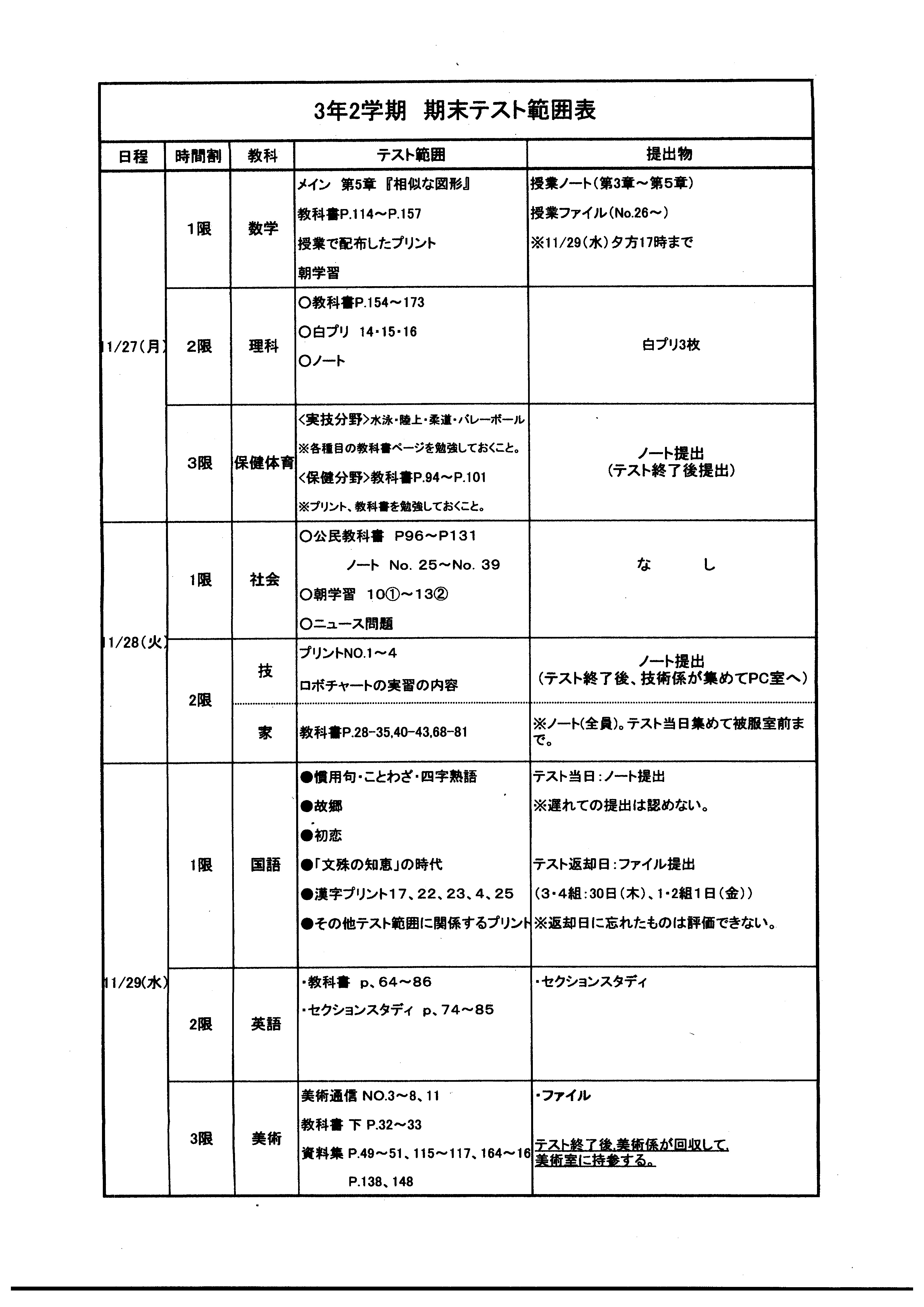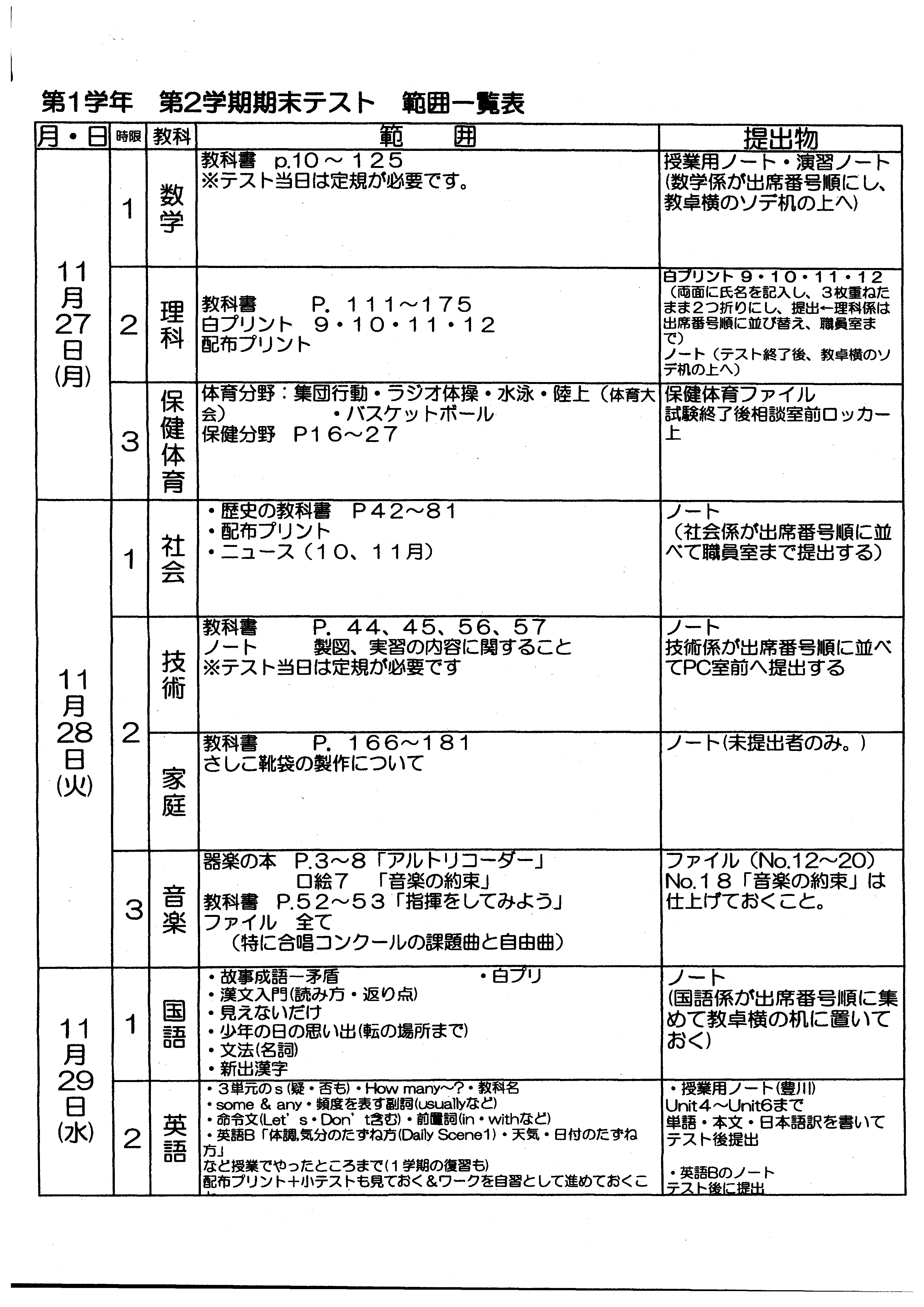 【期末テスト範囲表】