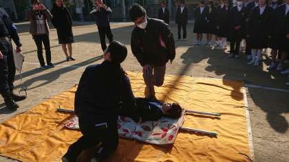 ◆身近なものを使った担架の作り方を消防署の方から教わりました。今回は、「毛布」と「物干し竿」を使った担架でした。予想以上にしっかりしたものができました。