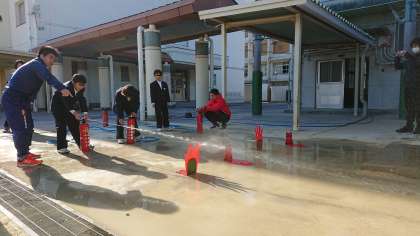 ◆火災発生時、初期消火が大切。身近なもの…消火器。使い方が分からないと消火ができないので、訓練用の消火器を使って学習しました。