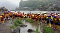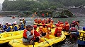河原に降りていよいよラフティング開始です。8名ほどのグループが1つのボートに乗り、インストラクターの方の指導に従ってラフティングを行っています。
