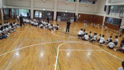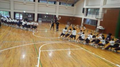 午後6時から体育館で夜のレクリエーション、綱引き大会をしています。どのクラスが勝つのかな。