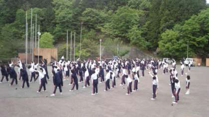 全員起床後、つどいの広場に集まって、ラジオ体操をしています。朝ごはんを美味しくいただくためにも全力で身体を動かそう。