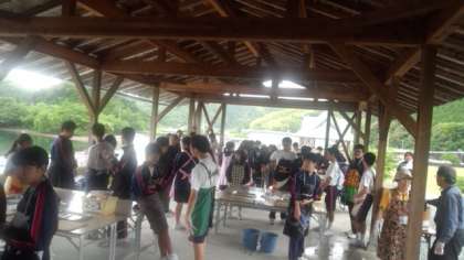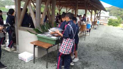 午前中の選択体験が終わり、これからお昼ごはんをいただきますが、自分たちで新鮮なカツオをさばいて藁やきにしていきます。カツオのたたき造りにチャレンジです。美味しいたたきを作りましょう。午後からも体験があります。しっかり作り、たくさん食べましょう。