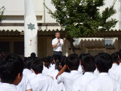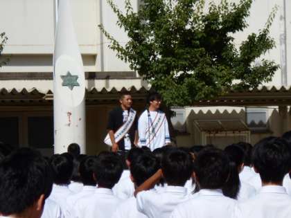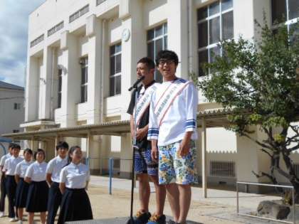 本日、7月2日(月)全校朝会に此花区に住んでおられる吉本興業の住みます芸人「かりんとう」のお二人が登場しました。恒例となった梅香中学校の夜間遠足(8月4日〜5日)をぼくたちと一緒に歩きましょう。僕たちの名前を覚えてと、持ちネタのギャグ「かりかり」と子どもたちに何度も披露していました。全校集会ということもあり子どもたちの表情も最初は堅かったものの最後は笑いや拍手もでてきました。おかげさまで一週間の始まりを笑顔でスタートすることができました。感謝いたします。