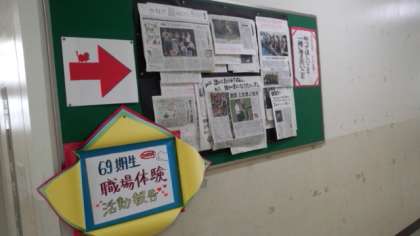 2年生の教室前廊下(3階)に6月6日(水)、7日(木)に実施した2年職場体験活動のまとめが個人新聞として展示されています。一人ひとりが学んだ活動記録を各事業所やお店ごとに感想などのコメントと共に活動写真も掲載されています。思い出に残った楽しかったこと、大変だったことなど思い思いに新聞を仕上げています。今日から個人懇談がスタートしていますので、ぜひ学校へお越しの際にはご覧いただければ幸いです。 頑張っているね!梅香中2年生