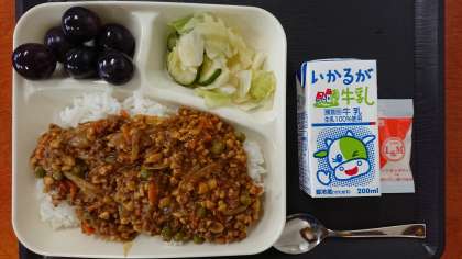 今回は、ひき肉の他に「ひきわり大豆」も入っています。また、小麦粉の代わりに「米粉」を使ったカレールウの素で味つけしているそうです。