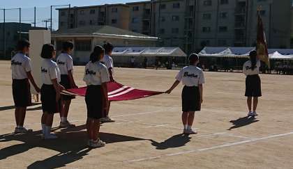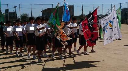 予定通り、入場行進が校旗を持った生徒会長を先頭に生徒会役員、1年生、2年生、3年生の順に行進していきました。