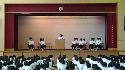 後期の生徒会役員について、1・2年生から立候補した7名が体育館で立ち会い演説会を行いました。