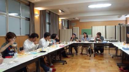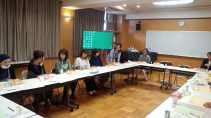 PTAでは、お昼の時間に給食試食会を開催しました。15名ほどの参加者が本日の献立のきのこのクリームシチューとキャベツのひじきドレッシング、みかん、コッペパン、牛乳を試食していました。その後、栄養教諭の先生から食育についての講話がありました。