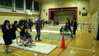 本日、1月24日(木)5・6時限目に2年生が特別支援教育の実践を行っていました。目的としては、次の2点でした。学校生活において、助けの必要なクラスメートに手を貸しているのと同様に、地域社会に出ても困っている人を見かけたら、親しみをもって手を差し伸べられるようにする。車いす体験やアイマスク体験、此花区社会福祉協議会の方の講話を聞いて、車いすを利用する人の気持ちを理解したり、目が見えない人の気持ちを考えたり、自分とは違う立場の人の気持ちを考える。