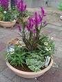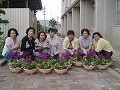作業の続きと出来あがった寄せ植えの写真です。最後に、作成した寄せ植えを各自の前に置いて全員で記念撮影をおこないました。