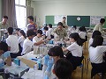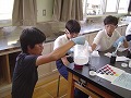 染料の調合具合で色が変わるので、どのようにすれば各自で決めた色が出せるのかを色見本をもとにして説明していただきました。担任の先生も入ってハンカチの染色をおこなっています。