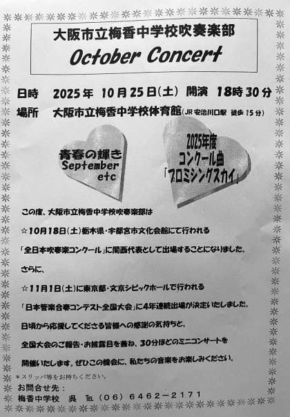 また、11月1日に東京都文京シビックホールにて開催される「日本管楽合奏コンテスト全国大会 中学生A部門」に出場させていただきます。