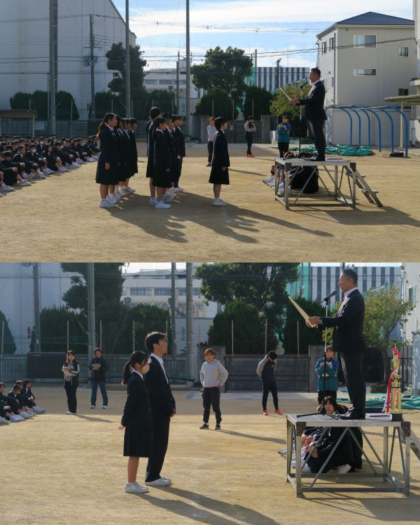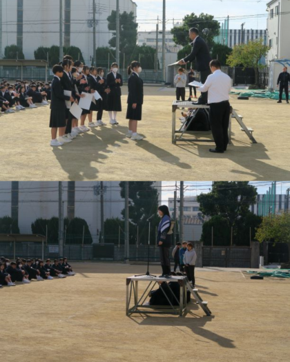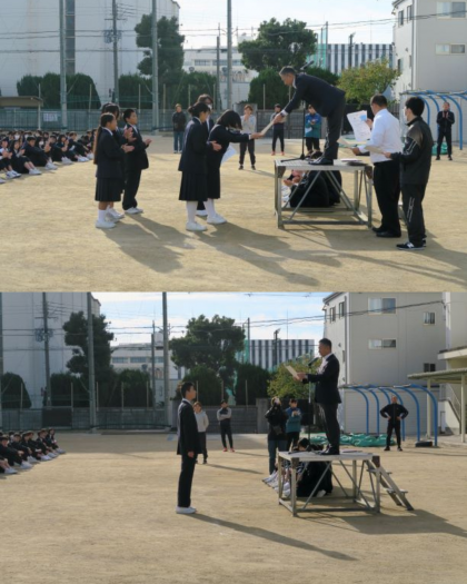 吹奏楽部全国大会最優秀賞表彰、女子バレー部第1ブロック優勝表彰、中国語弁論大会表彰、総合文化祭作品表彰、美術部作品表彰がありました。