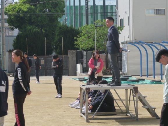 部活動にはそれぞれの部でルールがありますが、全部活動に共通したルールもあります。その中の「応援について」全校生徒が集まっているこの集会で確認します。試合などの応援は勝手に行ってはいけません。必ず顧問の先生に確認をするようにしてください。許可を得ても、決まった服装で行くようにしてください。応援するつもりで行っても、会場で顧問の先生が呼ばれることがあります。そういった場合、顧問が試合での指導ができなくなることがありますので、気をつけてください。