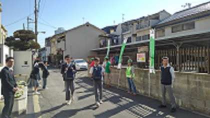 昨年度に引き続き此花区青少年指導員の方々が来られて、正門前であいさつ運動をしていただきました。(写真)