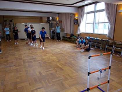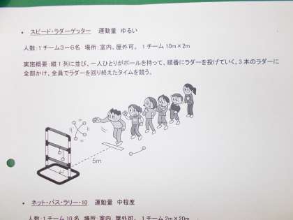 スポーツが苦手な子でも気軽に参加できる「スポーツ・レクリエーションクラブ」の取組が始まりました。1回の活動時間は、1時間半と短く、実施種目は誰もができて楽しめる種目です。第2回目は、今週14日金曜日です。気軽に誰でも参加してください。写真は、ひもでつながった2個のボールを投げて、梯子にからませて競う『ラダーゲッター』という種目です。参加した生徒は、みんな楽しくやっていました。興味がある人は、担当の菱川先生まで参加申し込み表を取りに来てください。