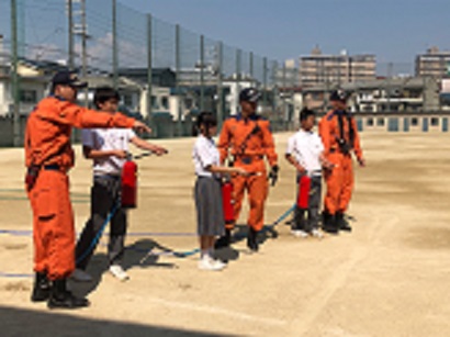 グラウンドに避難した後は、1年生は消火体験を行い、